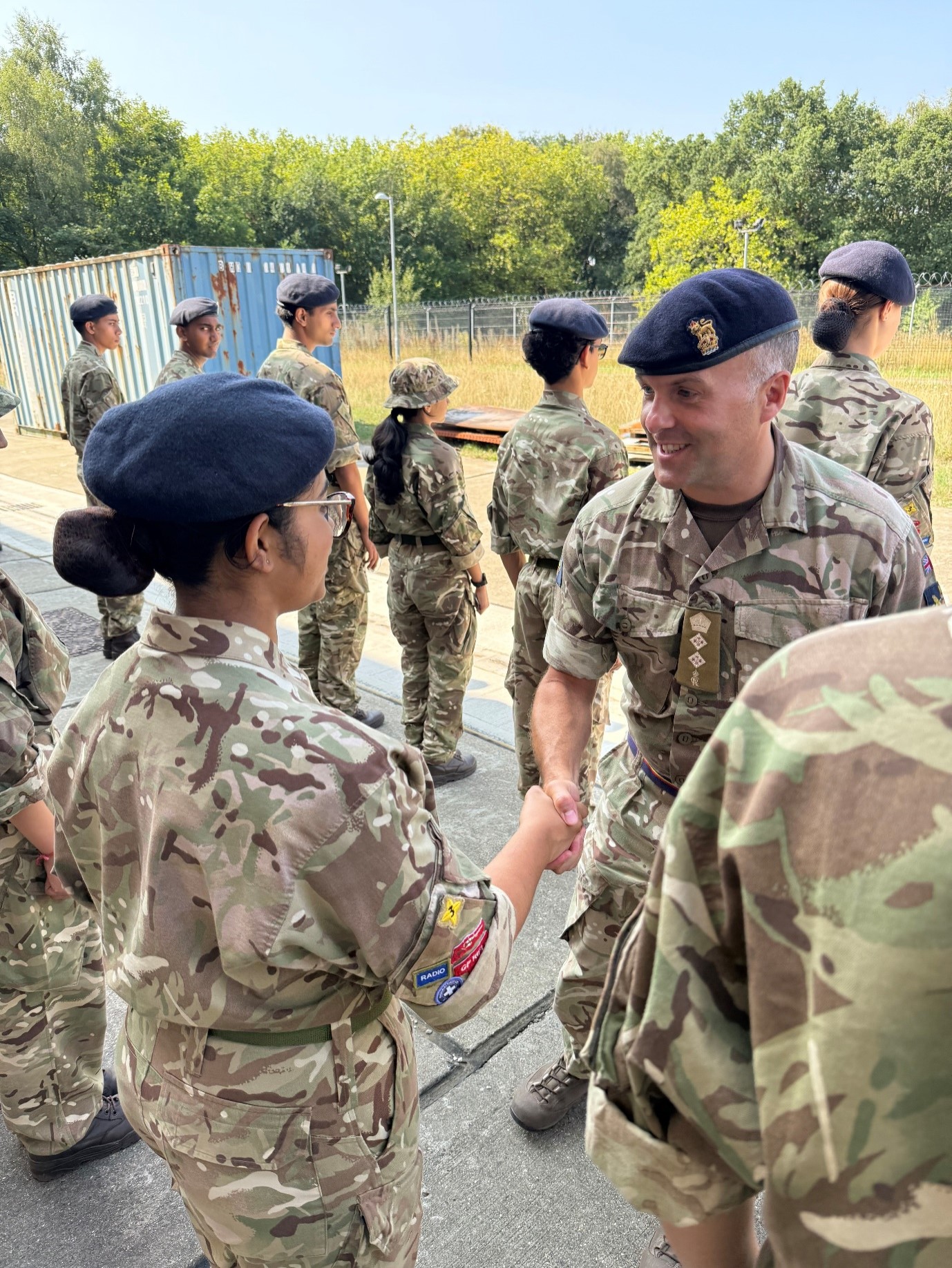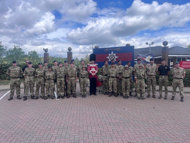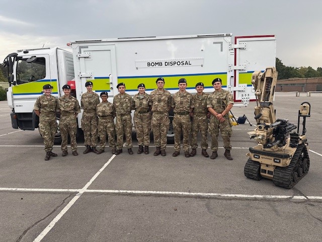 The Aldershot setting also enabled a diverse range of additional activities. Cadets enjoyed an Irish Guards camp walkaround and mascot meet, a visit to the 9 REME Battalion Metalsmiths and Recovery Mechanics, and an introduction to RLC Bomb Disposal vehicles and robots. Senior visits included Lt Col Mark Teesdale (SO1 Cadets Training, Regional Command) and Col Anthony Denison (Colonel Cadets, London District).