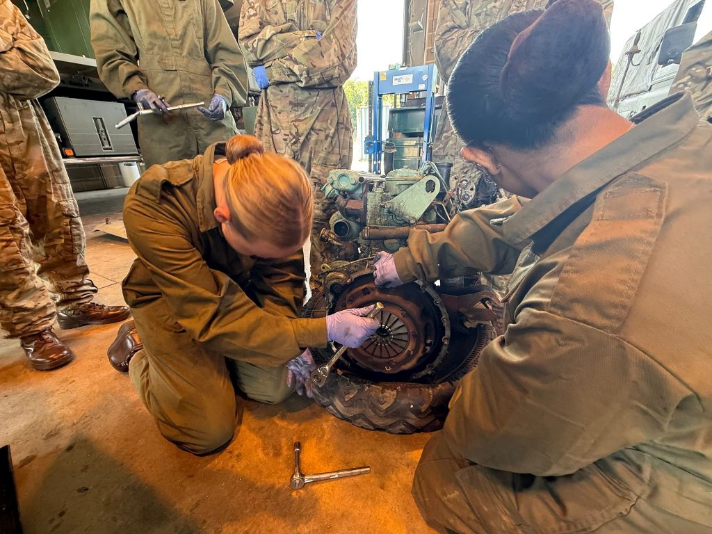 The Cadets were divided into four groups of five, each mentored by a REME Vehicle Mechanic Class 1. Over the course of the week, the Cadets worked step by step through the process of replacing a clutch plate on an Army Land Rover. Under supervision, they led much of the hands-on work themselves, with their mentors guiding technique and explaining principles in classroom sessions.